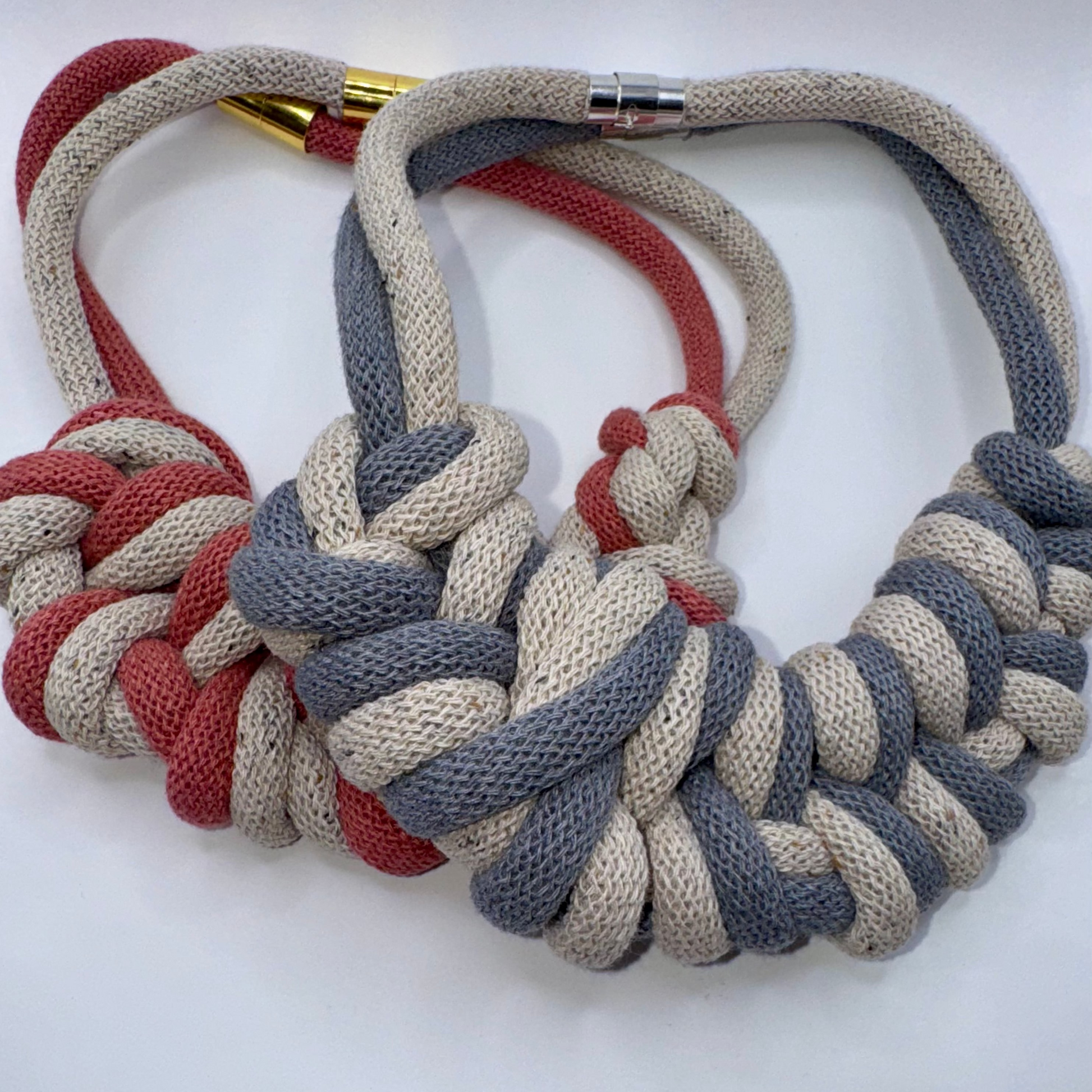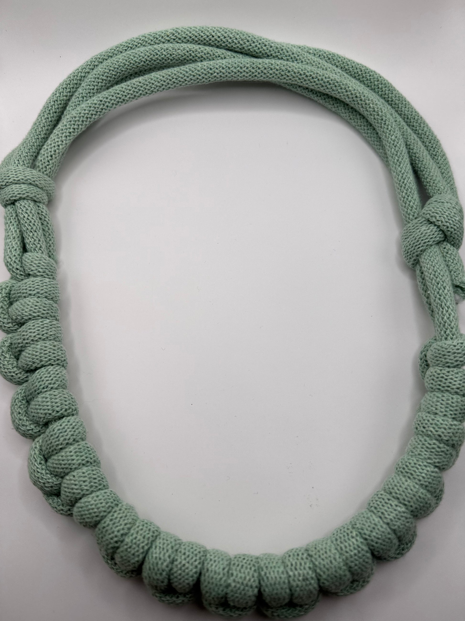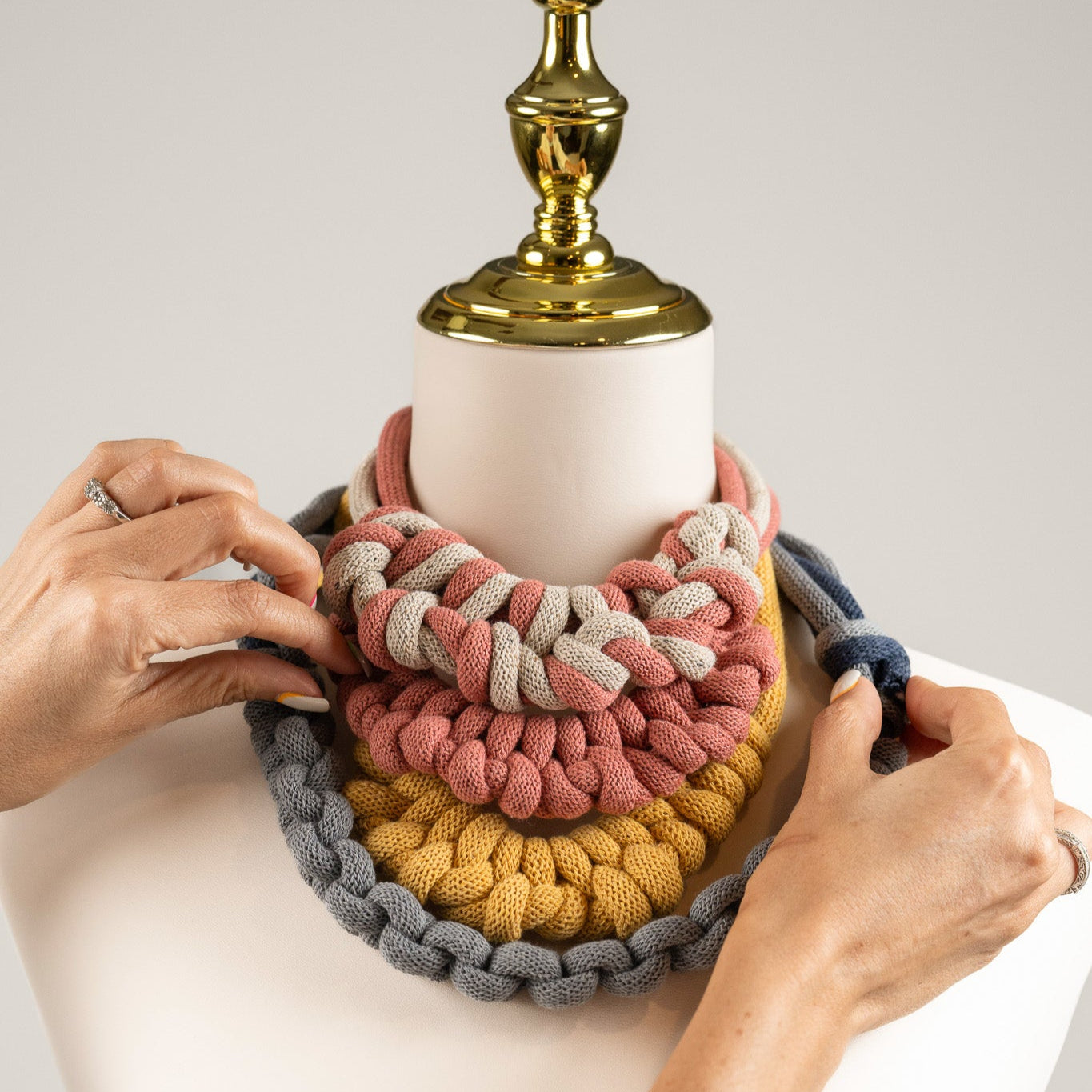 The Double necklace is crafted from recycled cotton cord, featuring a bold braided structure. Its intertwined design brings movement, texture, and presence to any look.